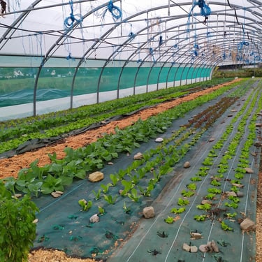 Les verdures et autres petits légumes sont "au chaud" sous la serre (mais demandent quand même une couverture supplémentaire en cas de gel...!)